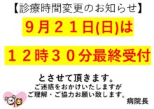 【診療時間変更のお知らせ】 9月21日(日)は12時00分 最終受付とさせて頂きます。 ご迷惑をお掛け致しますが、ご理解ご協力宜しくお願い致します。 病院長 Luluどうぶつ病院 Tel:04 …